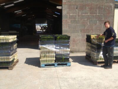 L’ensemble de la récolte peut ainsi être remonté vers les bâtiments pour être ensuite acheminés vers l’unité de valorisation. Cependant, afin d’optimiser le transport, des tests sur plusieurs méthodes de stockage ont permis de démontrer que ces algues peuvent être stockées plusieurs jours dans des installations courantes dans un bâtiment ostréicole. La méthode retenue, qui semble la plus simple à mettre en œuvre, est le froid sec. Dans ce cas, les bacs de stockage pleins d’algues (environ 12 kg chacun), gerbables, sont directement mis en chambre froide. Le test effectué au SMEL a démontré que les algues restaient dans un bon état pendant une dizaine de jours, ce qui est largement suffisant pour travailler les algues sur une période de vives eaux et d’en faire ensuite l’expédition en fin de marée. Toutefois, la qualité biologique de ces algues après stockage est actuellement en cours d’analyses.