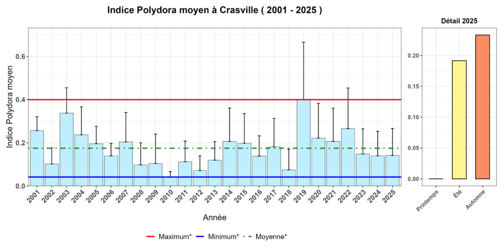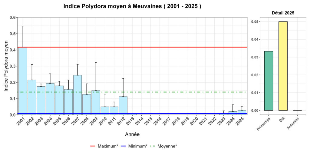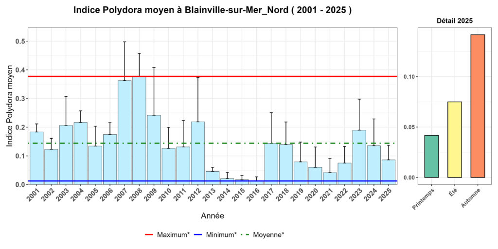 Cet indice rend compte du degré d’infestation des coquilles par les annélides des genres Polydora et Boccardia. Il est calculé à partir de la somme des pourcentages pondérés d’huîtres dans chacune des 5 classes d’infestation: