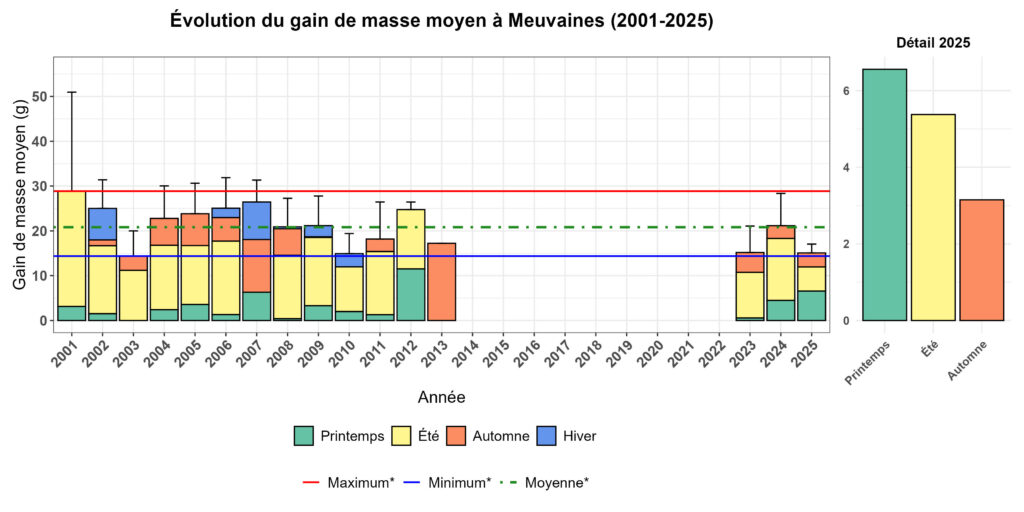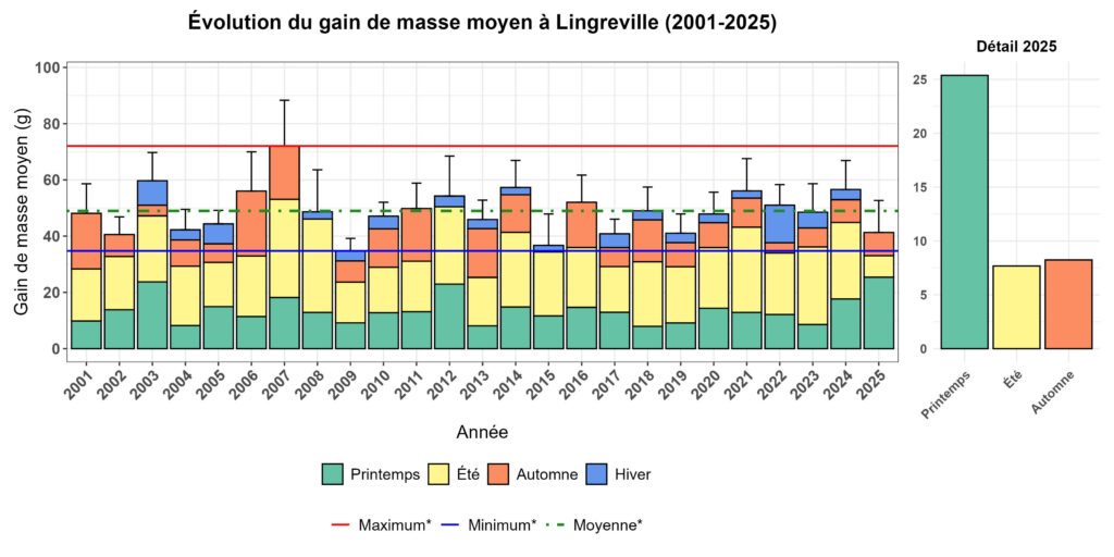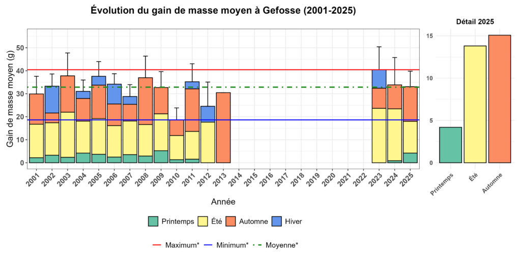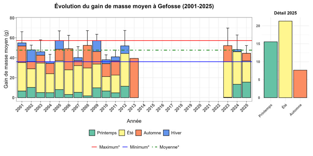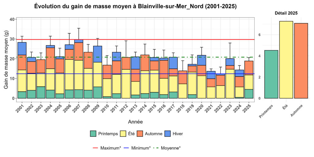 Gain de masse (g) = Masse totale moyenne à la date considérée – Masse totale moyenne à la mise à l’eau