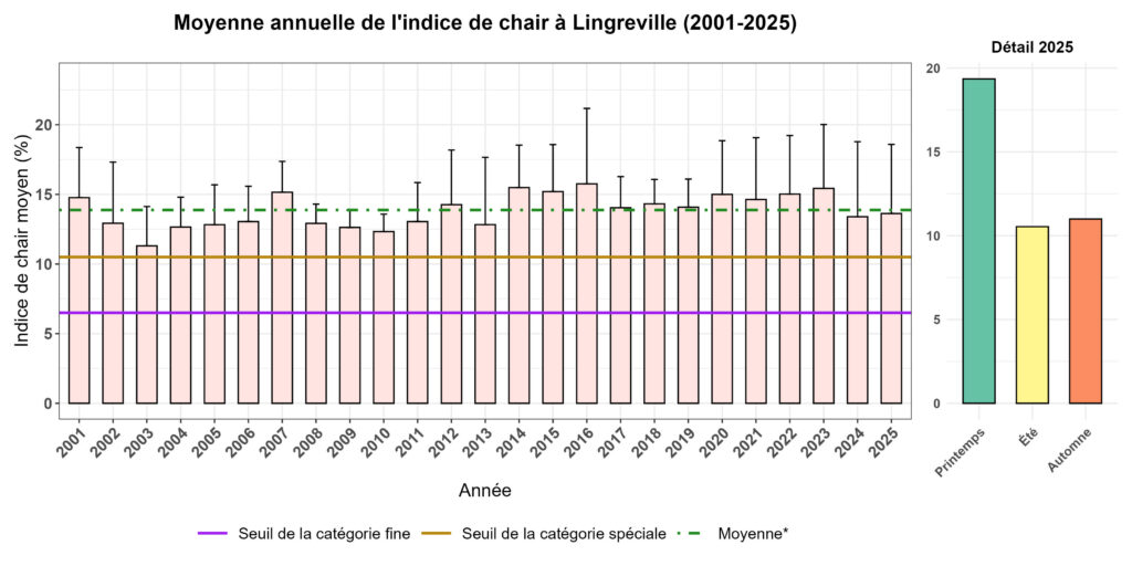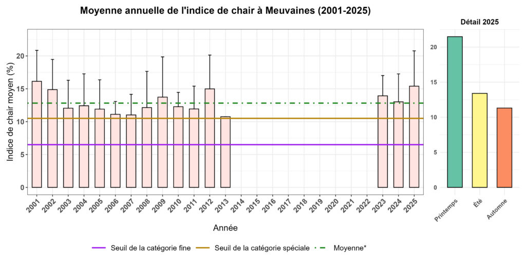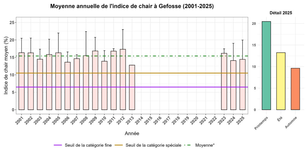 Les résultats présentés dans ce bulletin sont issus des dernières visites sur terrain, suite à la marée de Décembre 2025. Ils présentent les résultats de croissance et de mortalité pour le naissain et pour le 18 mois ainsi que les indices Polydora et de condition et le rendement d’élevage pour les adultes seuls.