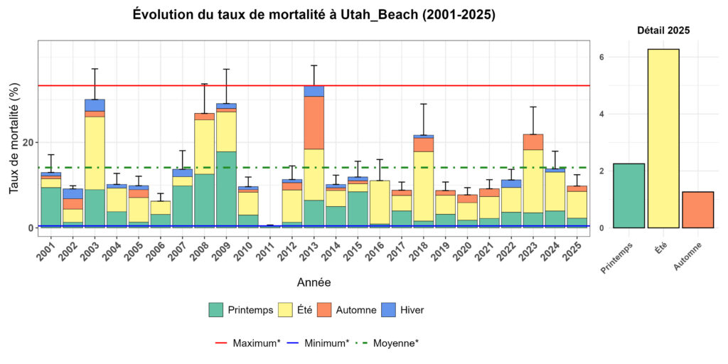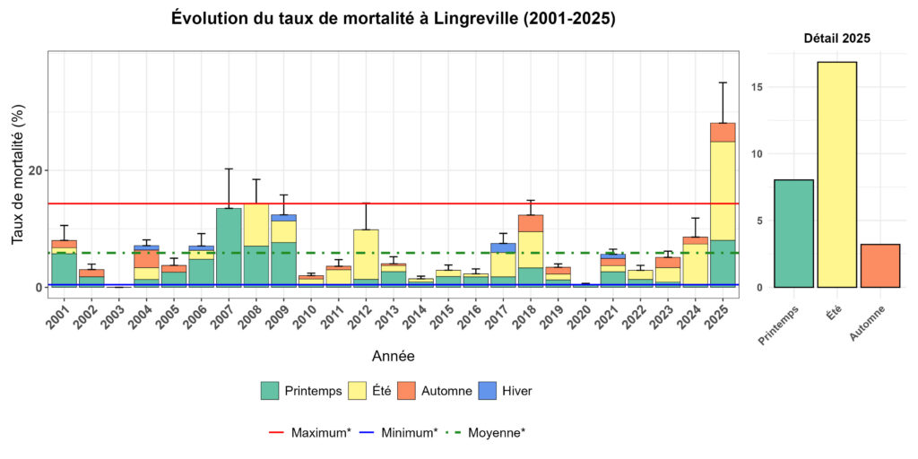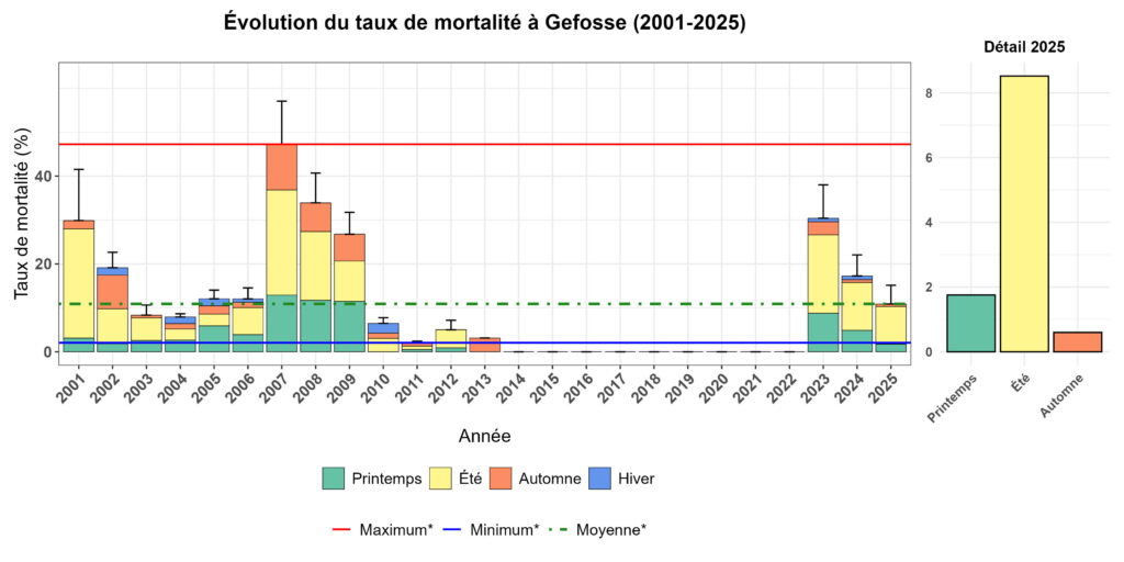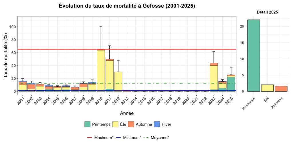 Lors de chaque visite un comptage exhaustif des individus vivants et morts est réalisé pour évaluer les pertes subies depuis la visite précédente. Les comptages permettent d’obtenir la mortalité. Le pourcentage de mortalité cumulé obtenu après chaque saison se calcule comme suit: