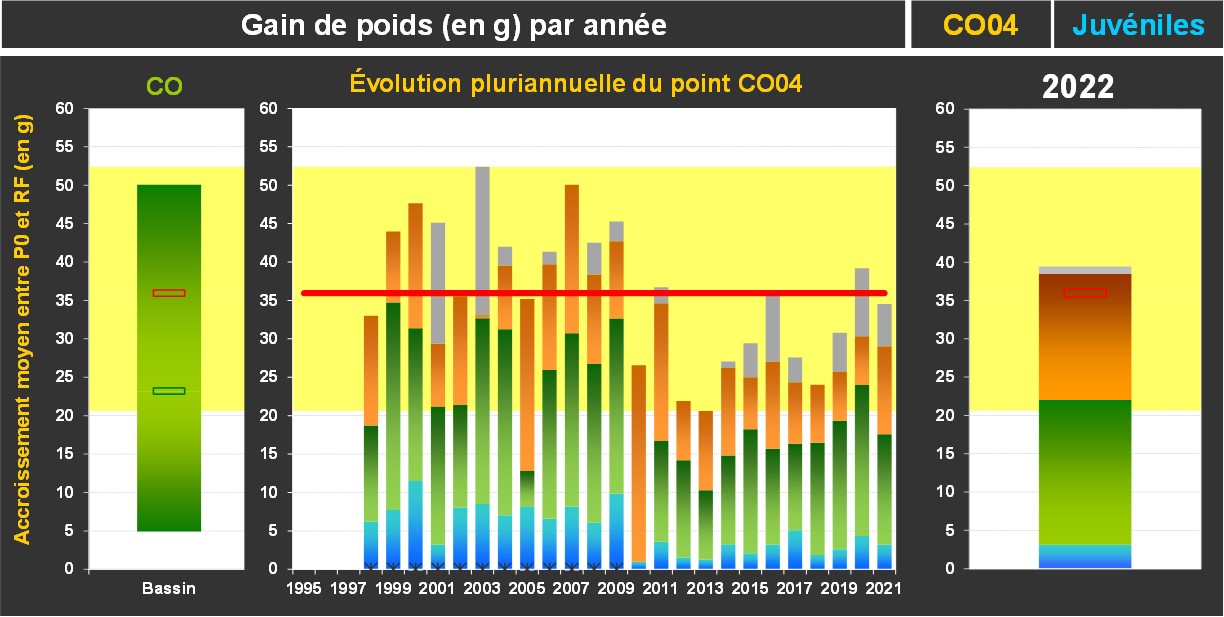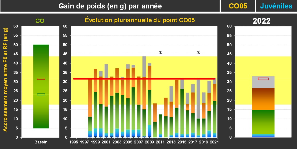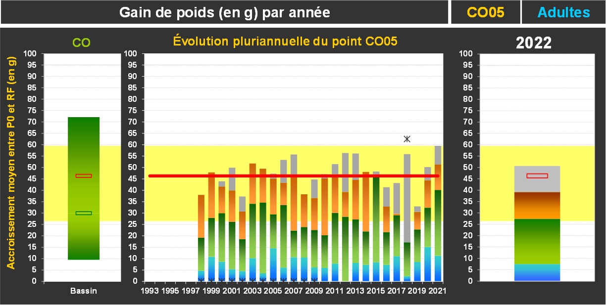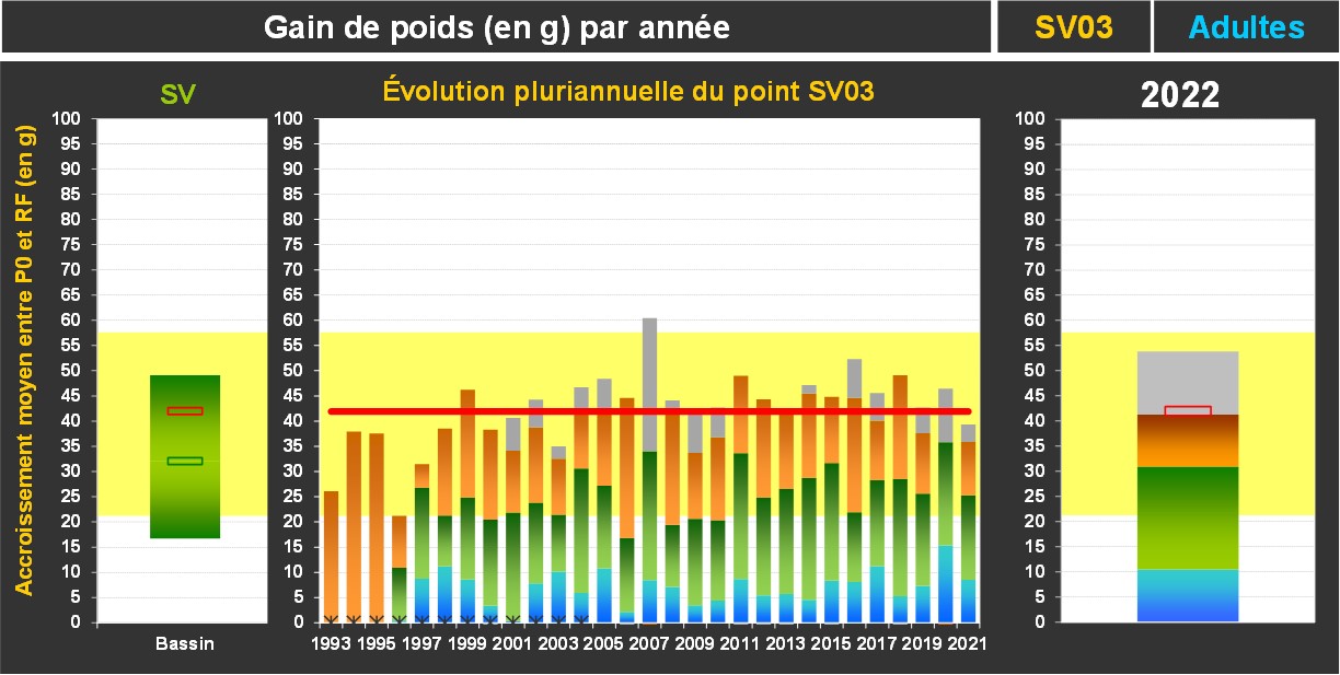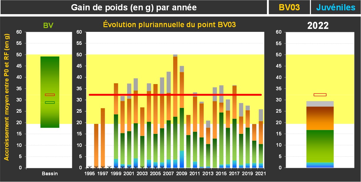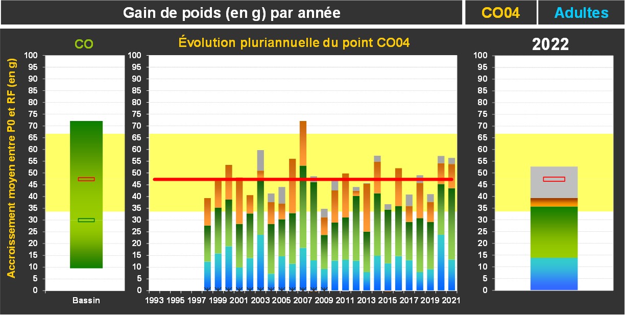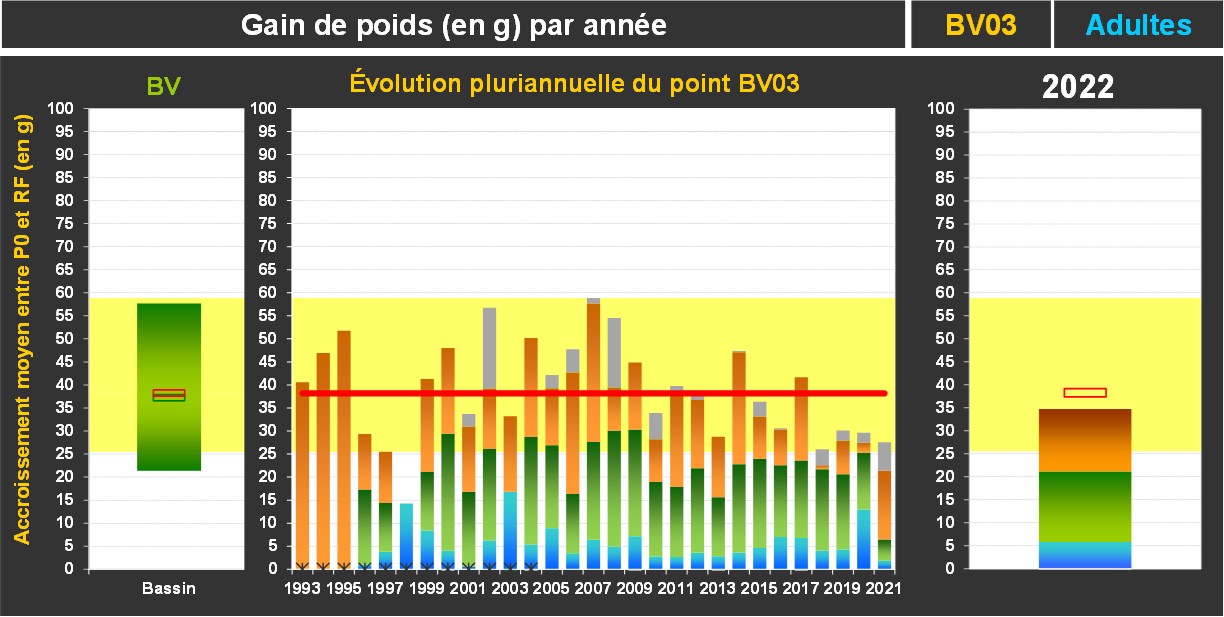 Gain de masse (g) = Masse totale moyenne à la date considérée – Masse totale moyenne à la mise à l’eau