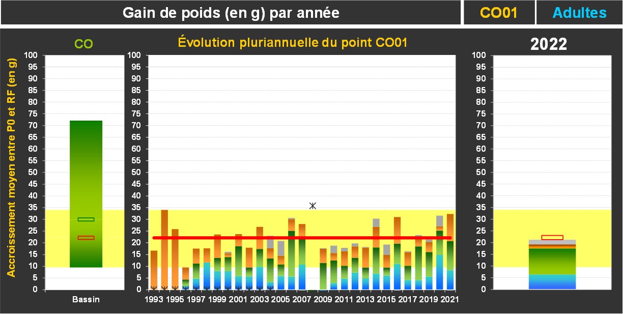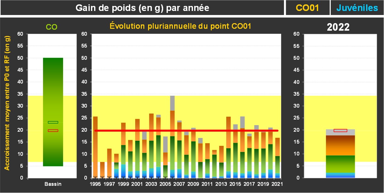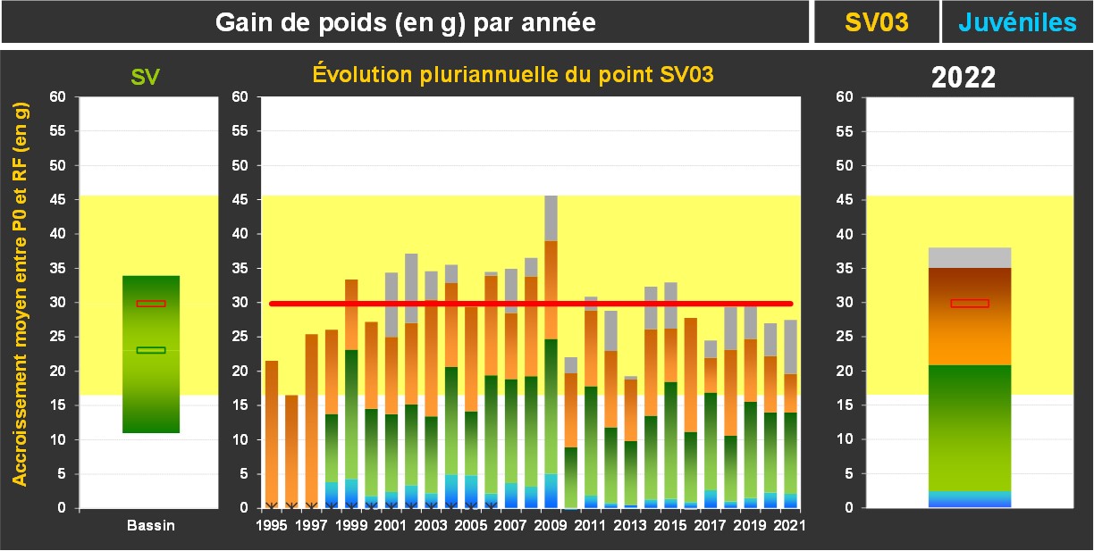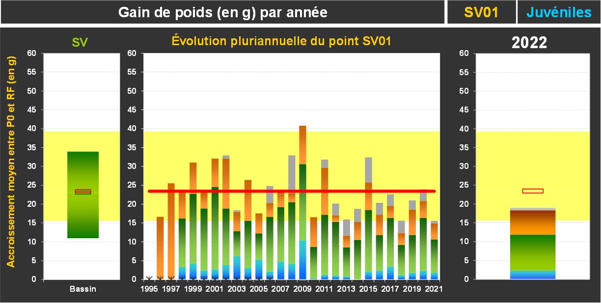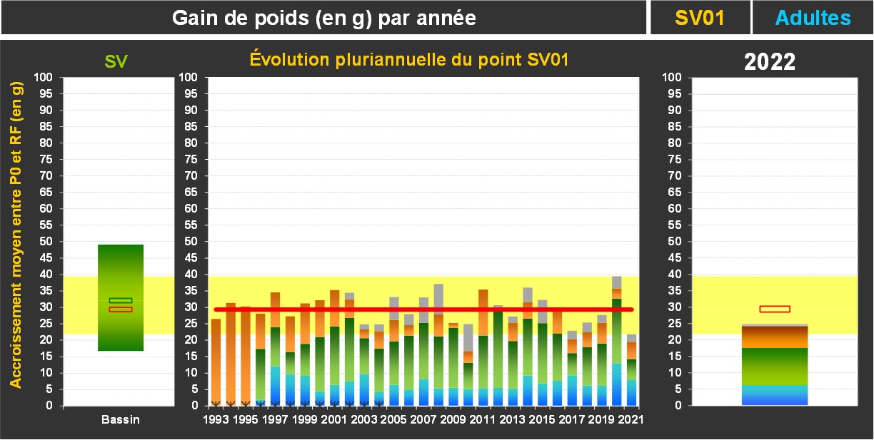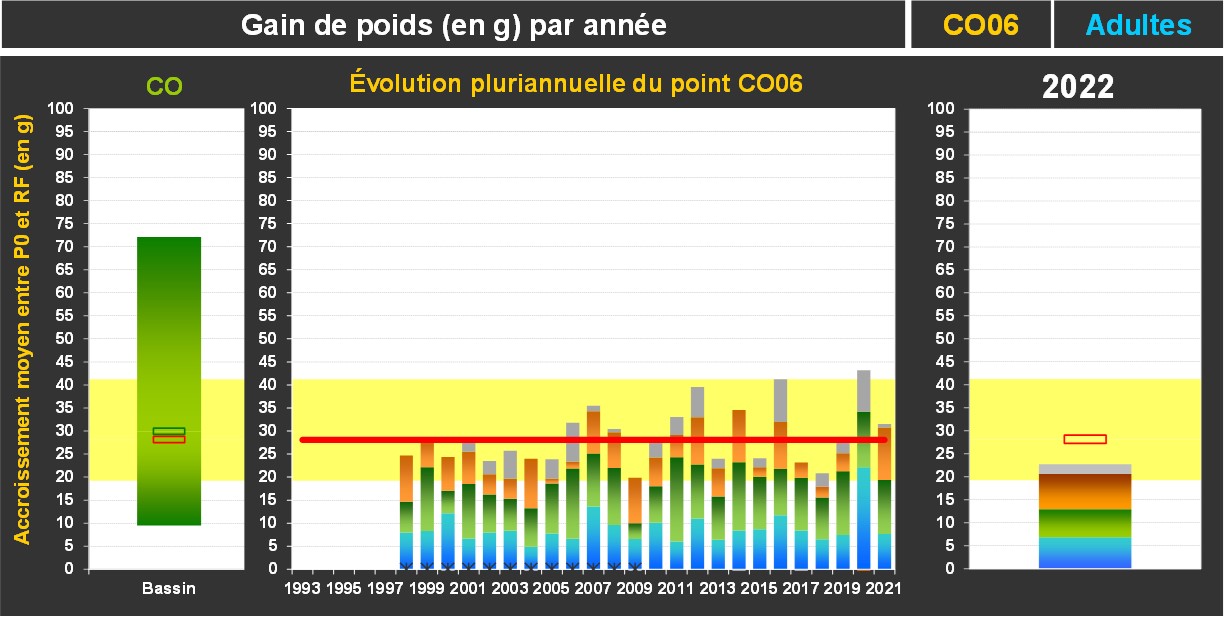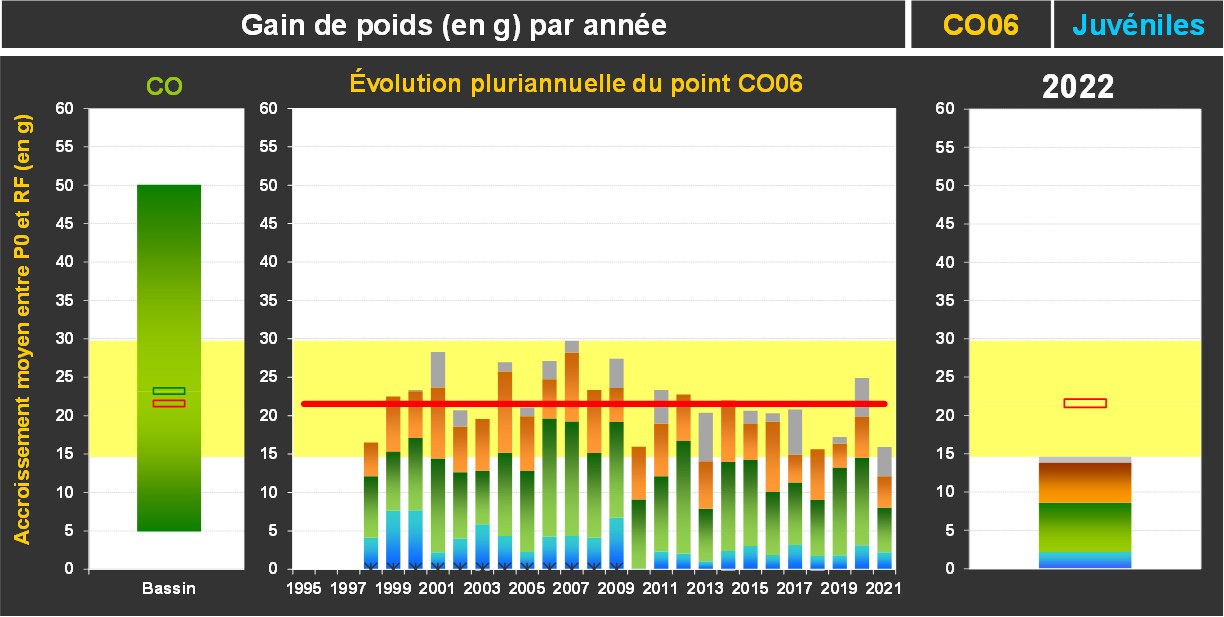 Gain de masse (g) = Masse totale moyenne à la date considérée – Masse totale moyenne à la mise à l’eau