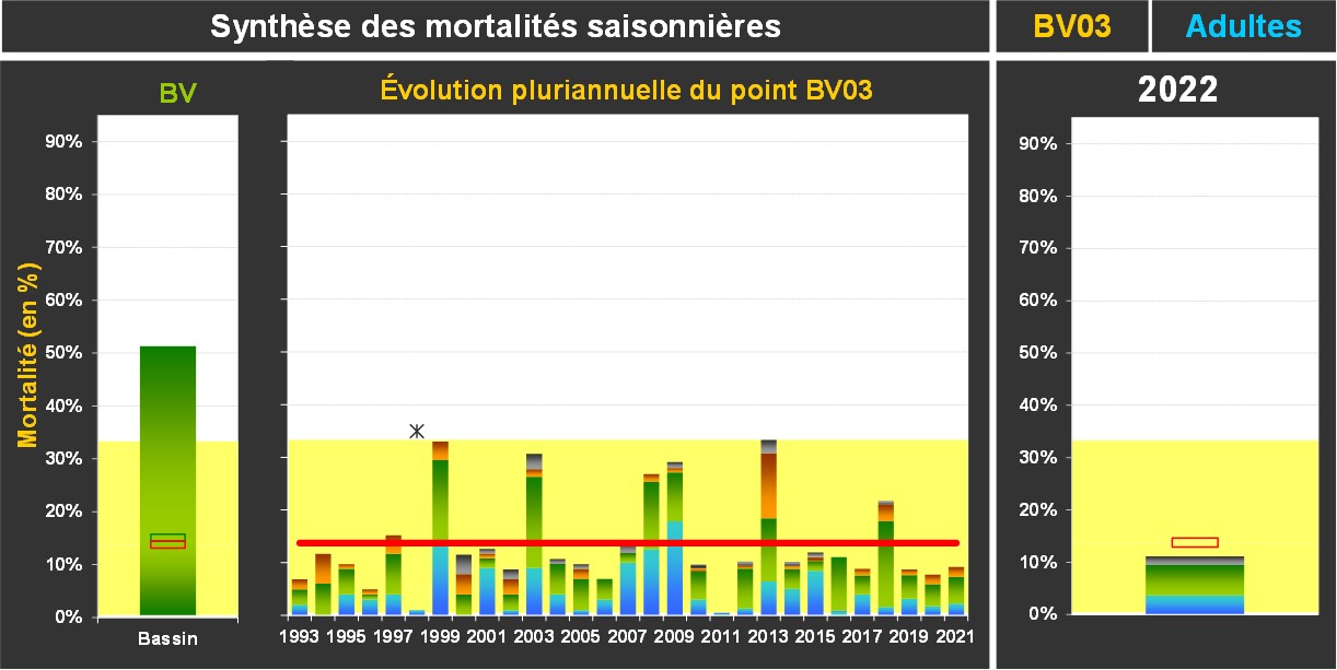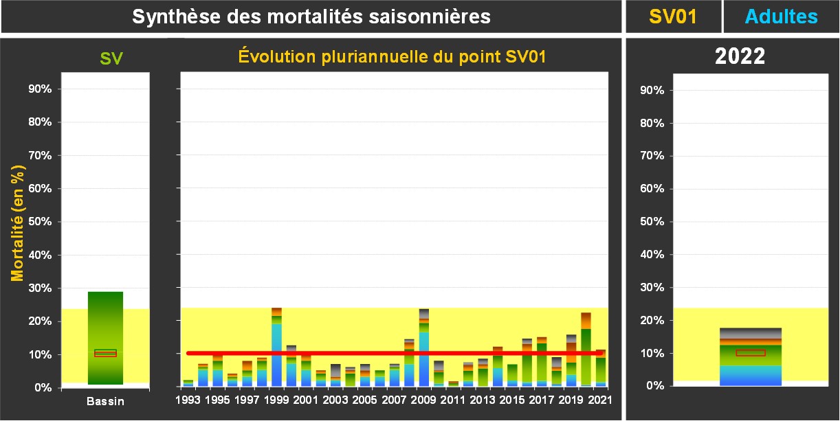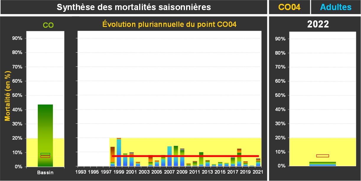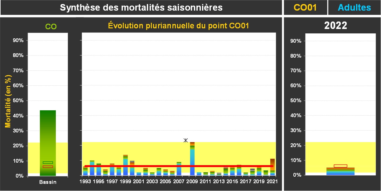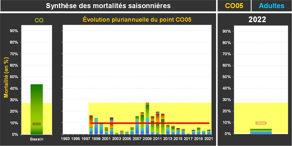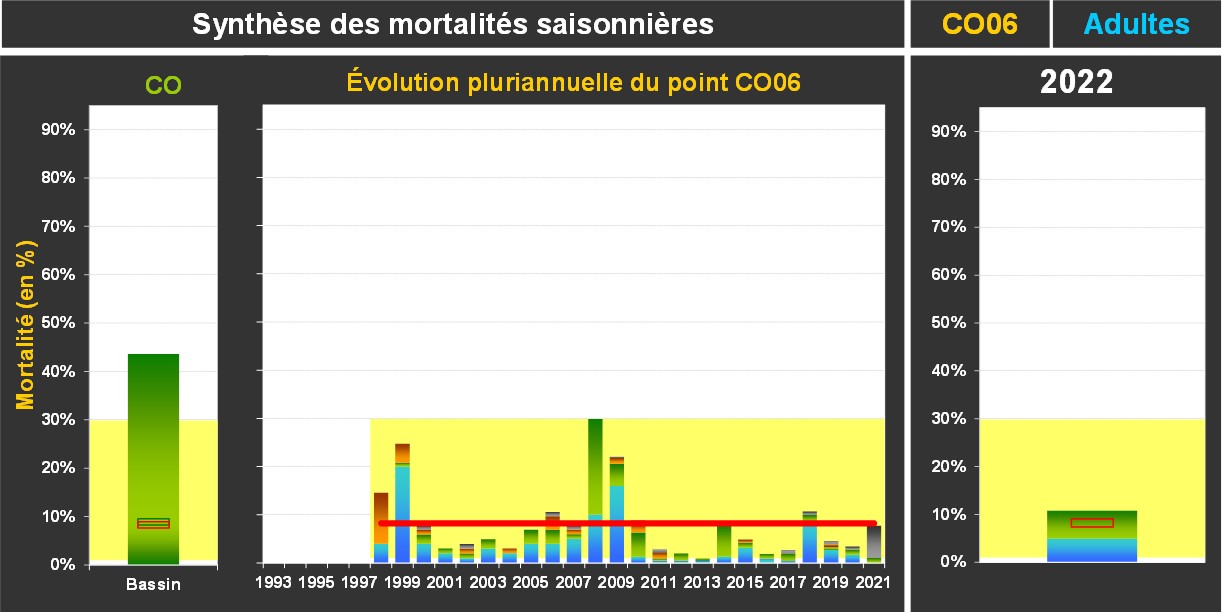Lors de chaque visite un comptage exhaustif des individus vivants et morts est réalisé pour évaluer les pertes subies depuis la visite précédente. Les comptages permettent d’obtenir la mortalité. Le pourcentage de mortalité cumulé obtenu après chaque saison se calcule comme suit: