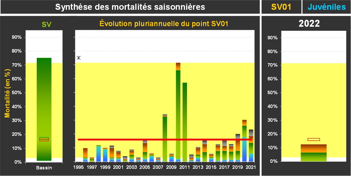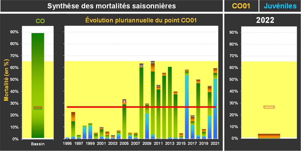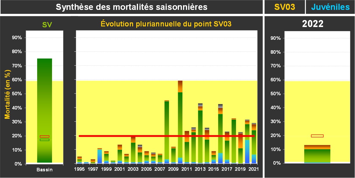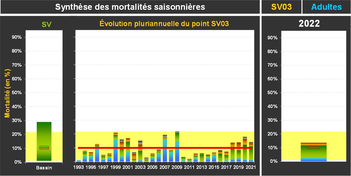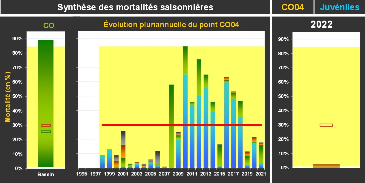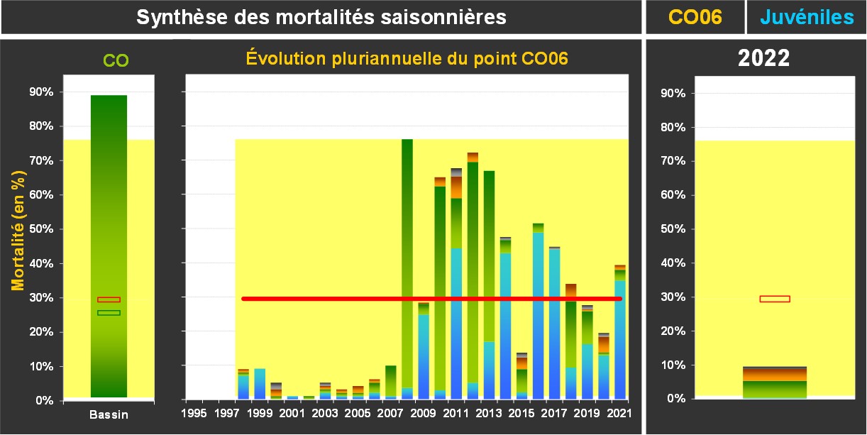 Lors de chaque visite un comptage exhaustif des individus vivants et morts est réalisé pour évaluer les pertes subies depuis la visite précédente. Les comptages permettent d’obtenir la mortalité. Le pourcentage de mortalité cumulé obtenu après chaque saison se calcule comme suit: