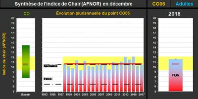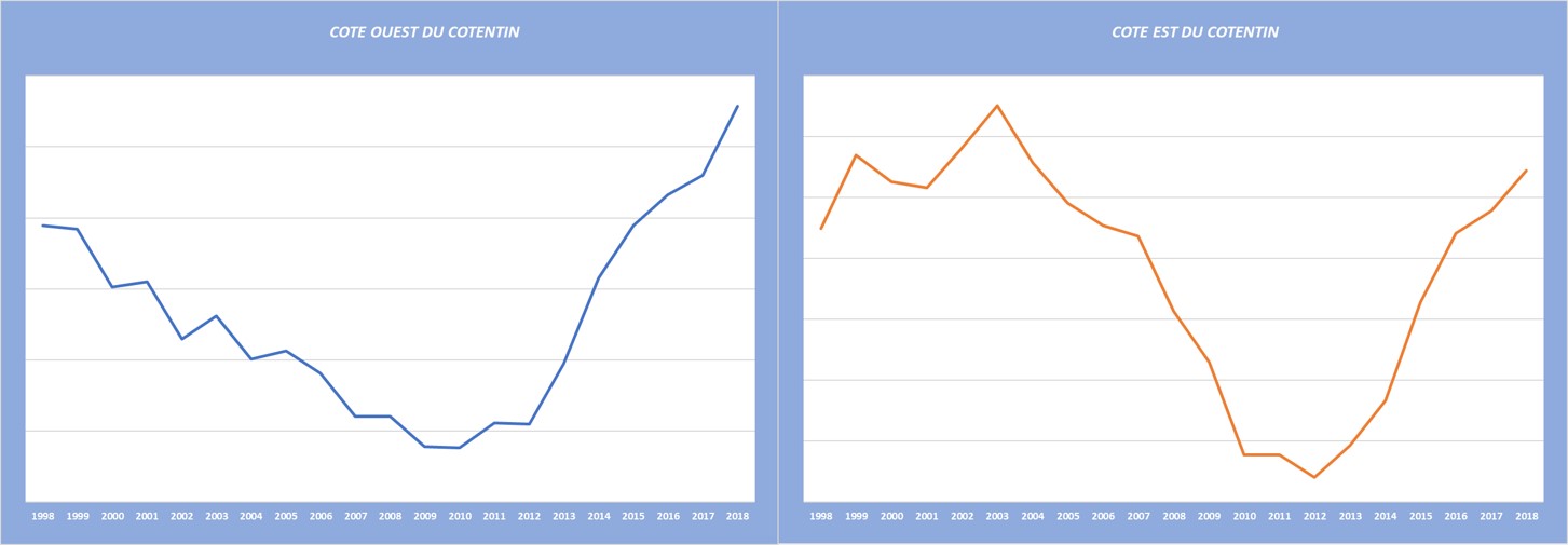 Les courbes de tendance de l’indice de chair incluant l’ensemble des stations des côtes Ouest et Est du Cotentin confirment l’impression laissée par les résultats bruts. Pour la côte Ouest, la tendance est clairement à une amélioration de l’indice alors que pour la baie de Seine, la tendance de ces dernières années montre un retour aux performances du début des années 2000 après un net recul de l’indice AFNOR.