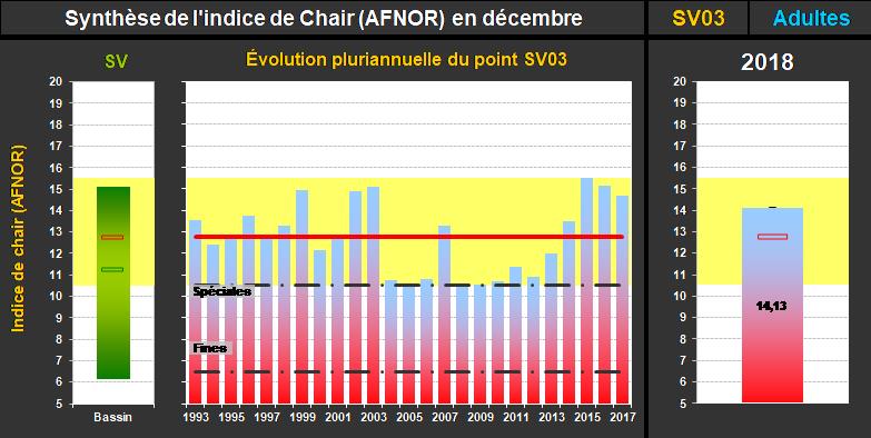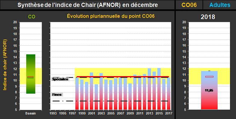 Les graphiques de suivi de l’indice du taux de remplissage semblent montrer que les huîtres sont plus charnues ces dernières années et que cette tendance est visible sur les deux grands bassins manchois. Pour la côte Ouest, l’exemple de la station de Blainville / Mer montre des huîtres plus régulièrement classées en spéciales depuis 2010 (7 fois ces 9 dernières années) alors qu’elles n’avaient dépassé la limite de 10,5% de chair qu’à deux reprises entre 1998 et 2009.