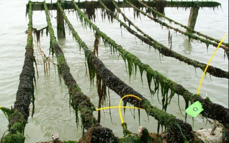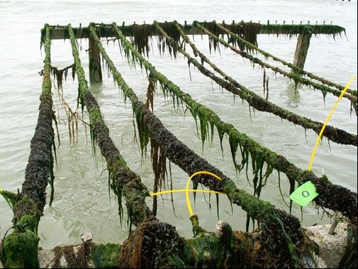 Un développement de macro-algues ; principalement des entéromorphes, peut être observé sur ces cordes à la fin du printemps. Depuis quelques années, la plupart des mytiliculteurs utilisent l’eau de Javel pour détruire cette flore associée. Toutefois cette pratique est susceptible de provoquer des perturbations pour l’environnement et pour la croissance de la moule.