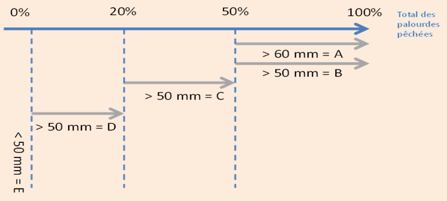 Associée à cet indice, une répartition (en %) en classe de taille est demandée (qualitatif), cette répartition permettra de fournir une indication sur la taille des palourdes pêchées : 4 à 5 cm, 5-6 cm plus de 6 cm. Afin de faciliter la lecture et l’interprétation des résultats cette répartition sera classifiée en A, B, C, D et E.