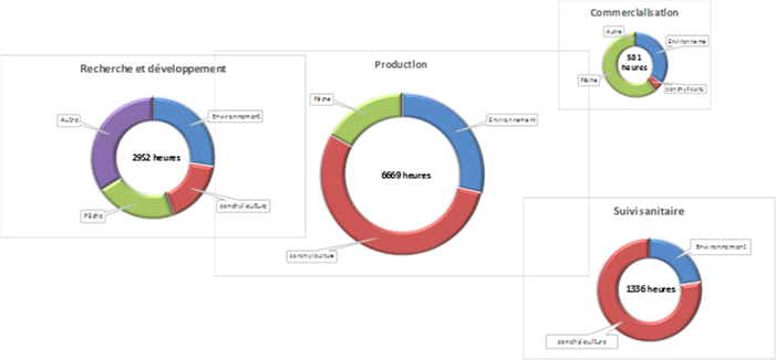 Ainsi, 6669 heures ont été consacrées au soutien technique des productions, 2952 heures ont été dédiées à la recherche et au développement, 1336 heures ont été nécessaires au suivi sanitaire et enfin 581 heures aux questions relevant des aspects commerciaux.