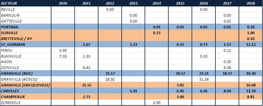 Le recrutement des huîtres sauvages sur les côtes du département de la Manche est suivi par le SMEL depuis 2013. Le protocole utilisé pour ce suivi est largement inspiré de VELIGER, programme de l’IFREMER, mais adapté aux conditions normandes. 4 secteurs ont été choisis pour suivre le recrutement des juvéniles d’huîtres : Carolles au sud de la zone, Granville où les densités sont les plus importantes, Saint Germain / Ay au nord de la zone impactée et Portbail, site vierge mais surveillé pour voir apparaître une éventuelle colonisation vers le nord, comme observé dans d’autres régions. Dans chacun de ces secteurs, la totalité des huîtres sont enlevées sur des zones de 1m², initialement fortement colonisées. Puis, chaque année, un comptage des nouvelles arrivées est effectué entre les mois de décembre et février. Le tableau suivant montre les différents comptages depuis 2013.