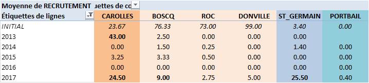 Depuis le début de ce suivi, on note deux années de recrutement « important » que sont 2013, uniquement sur le secteur de Carolles, et 2017 encore sur Carolles mais également à Saint Germain / Ay. Pour cette dernière année de recrutement, ce sont les secteurs nord et sud qui ont vu l’arrivée conséquente d’huîtres alors que le secteur de Granville, pourtant central et fortement peuplé, a un recrutement 5 fois moins important. Quant à Portbail, c’est la première année que de jeunes huîtres y sont observées, en de très faibles quantités mais justifiant pleinement le statut de secteur de veille.