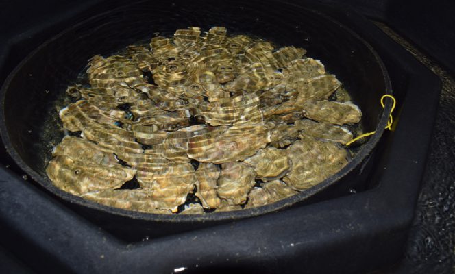 Ainsi, sans être sous l’influence de la lune, ces cycles de marée, alternant marée basse, marée montante, marée haute et marée descendante, sont appliqués sur un lot d’huîtres adultes destinées à être affinées. Dans le cas de cette expérience, seul le facteur « durée d’émersion » varie, l’ensemble des autres facteurs externes comprenant la température, l’alimentation (en forte interaction avec le niveau bathymétrique sur estran) et les autres paramètres physicochimiques de l’eau de mer, est fixe et contrôlé.