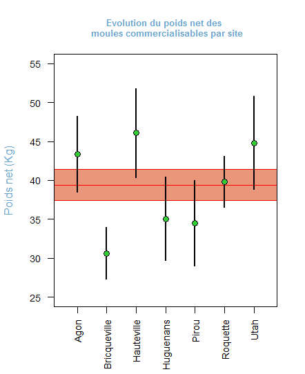 La production mytilicole normande est riche et variée. Plus ou moins proches d’estuaires (Sienne sur la côte Ouest, la Baie des Veys sur la façade orientale de la Manche), les sites de production suivis se caractérisent par des productivités sur pieux différentes. La productivité décennale moyenne normande est de 39 Kg de moules par pieux (graphique 1). Trois sites présentent des poids nets moyens de moules les plus forts, compris entre 44 et 46 Kg : Agon et Hauteville (côte Ouest Cotentin) et Utah (Côte Est Cotentin). Le site de la Roquette (Chausey) présente un poids net moyen proche de la moyenne régionale avec 40 Kg de moules par pieux. Les sites de Pirou et Huguenans (Chausey) présentent des poids nets moyens d’environ 35 Kg de moules par pieux. Enfin, le poids net moyen de moules du site de Bricqueville est de 30 Kg.