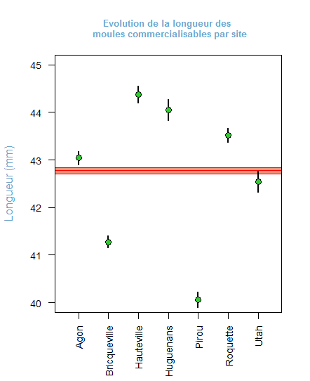 En termes de longueur de coquille (graphique 2), les moules produites à Hauteville, aux Huguenans et à la Roquette (Chausey) sont de longueurs moyennes supérieures avec des tailles allant de 43,5 cm à 44,5 cm. Celles produites à Utah et Agon sont de longueurs moyennes proches de la moyenne décennale régionale (42,8 cm). Les moules les moins longues sont celles produites à Bricqueville (41,2 cm) et Pirou (40 cm).