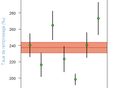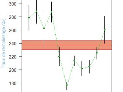 Le suivi standard permet de visualiser au sein de chaque année les rythmes saisonniers expliquant la productivité nette finale (Cohérence des deux méthodes montrée statistiquement). Le paramètre le plus corrélé avec les paramètres de production est le taux de remplissage (exprimé en poids sec indice de Wayne et Mann). Ainsi, les meilleures années de production vont de pair avec de forts gains de taux de remplissages obtenus au printemps et en été (dernière moitié d’un cycle annuel). A l’inverse, les années de faibles productions nettes, sont fortement corrélées avec de forts gains de taux de remplissage obtenus en hiver (caractéristiques retrouvées autour de 2010). Là encore, la variabilité interannuelle des facteurs climatiques joue un rôle majeur (graphique 7).