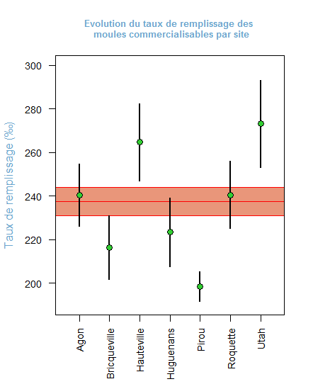 Enfin, les moules présentant les plus forts taux de remplissage (graphique 3) sont produites à Hauteville et Utah. Celles produites à Agon et à la Roquette (Chausey) présentent des taux de remplissage similaires à la moyenne décennale régionale. Les taux de remplissage les plus faibles sont observés avec les moules de Huguenans (Chausey), Bricqueville et Pirou.