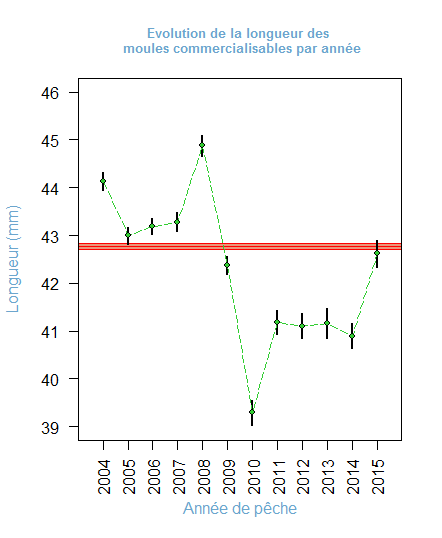 L’évolution de la longueur moyenne régionale des moules commercialisables (graphique 5) est elle aussi caractérisée par un premier pic mais cette fois-ci observé en 2008, et suivi par la même chute importante centrée sur l’année 2010. Par contre, si les moyennes régionales augmentent ensuite, elles restent stables (autour de 41 mm) de 2011 à 2014. Il faut attendre 2015 pour voir une très nette augmentation atteignant la moyenne décennale (42,8 mm).
