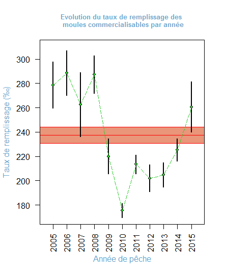 D’autre part, le taux de remplissage moyen régional des moules commercialisables suit une évolution marquée par des valeurs fortes et stables de 2005 à 2008, puis une chute importante toujours centrée sur 2010 (graphique 6). S’ensuit une légère hausse de 2011 à 2013 puis une seconde augmentation beaucoup plus forte à partir de 2014 atteignant, en 2015, des valeurs proches de celles observées au début de la période considérée.