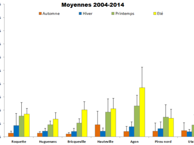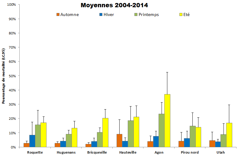 Le suivi des mortalités est réalisé dans le cadre du suivi standard des moules en panier (graphique 8). De 2004 à 2014, dans une très grande majorité des cas, ces mortalités sont associées à la présence de prédateurs tels que les bigorneaux perceurs, impactant plus particulièrement des secteurs comme Agon (Basuyaux, 2012).