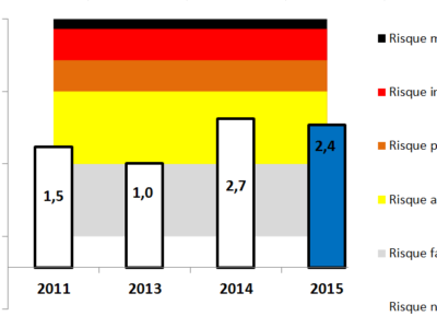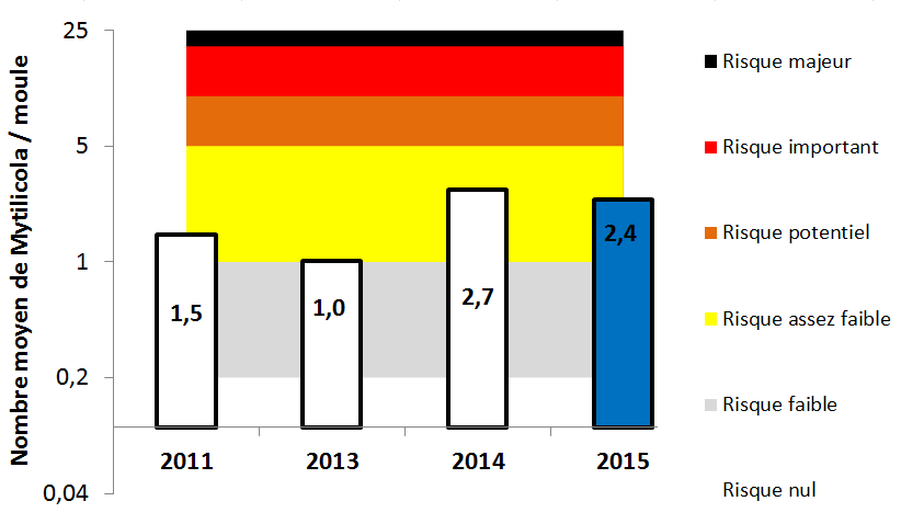 Suite aux très préoccupantes années de faible production, le SMEL a initié des investigations concernant un parasite de la moule, Mytilicola intestinalis (Basuyaux, 2011). Après cette étude, qui a notamment permis de mettre au point une méthodologie pour dénombrer ce parasite, un suivi annuel a été mis en place dans le cadre du réseau REMOULNOR depuis 2011. Les résultats obtenus montrent que le risque associé à Mytilicola est faible à assez faible dans notre région (graphique 9).