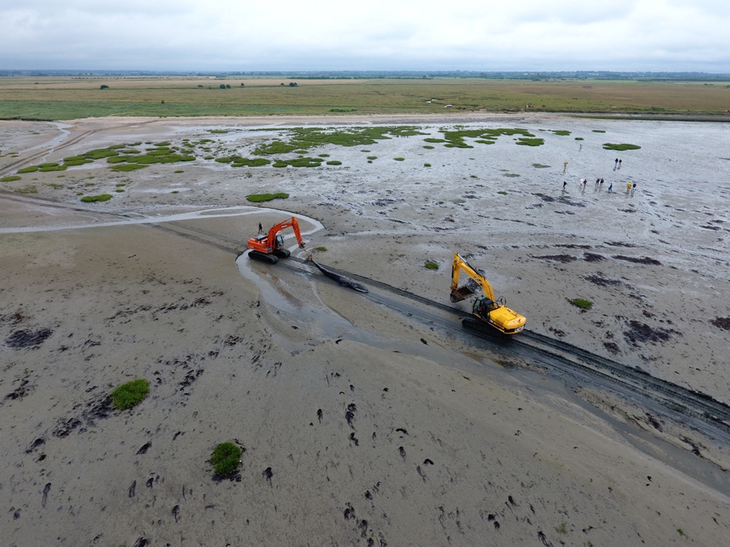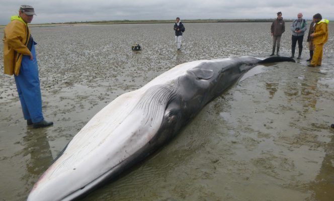 Le soir du mercredi 28 juin un rorqual de 10m est signalé échoué dans la baie des Veys, sur la plage de la commune de Brevands.