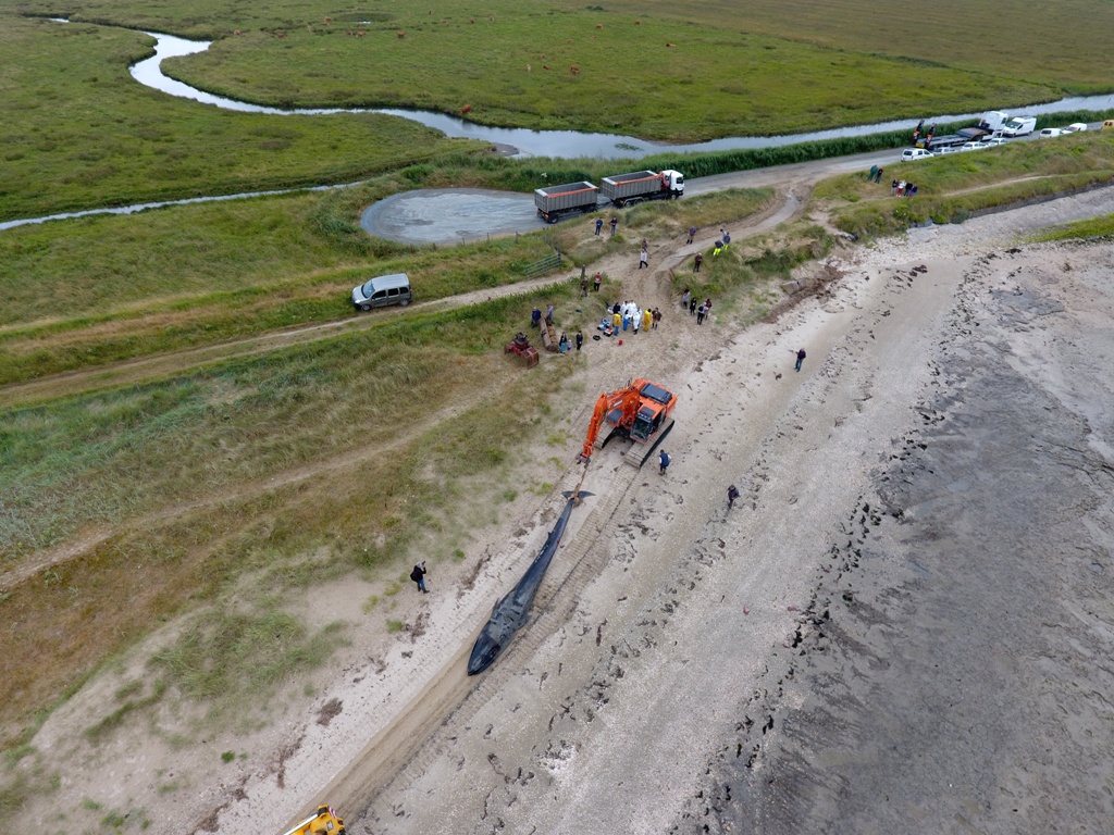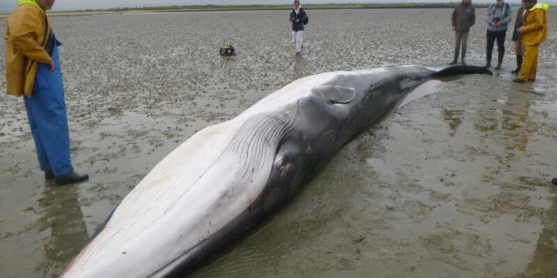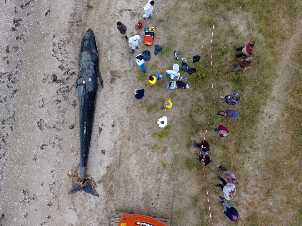 Dès le lendemain, l’équipe de l’observatoire Pélagis a contacté les correspondants locaux et a organisé l’extraction de cet imposant échouage. Le vendredi matin, une dizaine de personnes du réseau s’est présentée pour effectuer les examens et les prélèvements d’échantillons nécessaires pour tenter de comprendre la mort de l’animal.