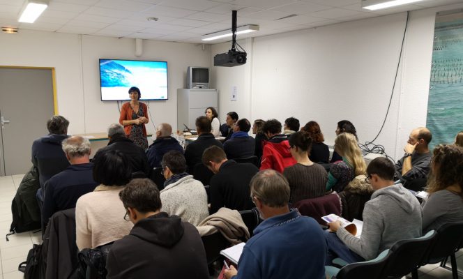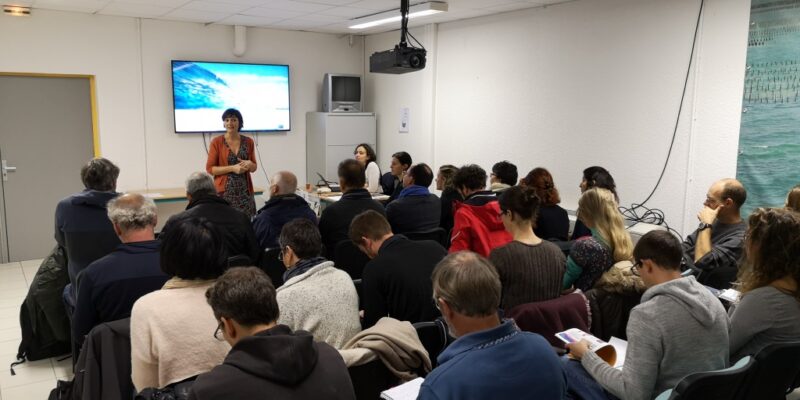 Afin de faire connaitre ce programme et favoriser la diffusion de ses actions dans les régions françaises, une délégation de l’IFREMER, incluant la coordinatrice du projet Isabelle Arzul (Station de la Tremblade), est venue présenter les objectifs et les premiers résultats de cet ambitieux projet aux acteurs normands. Les invités de cette demi-journée, comptant des représentants des comités régionaux professionnels de la conchyliculture et de la pêche en Normandie, de la SATMAR, des DDTM, des centres de formation (CFPPA de Coutances et lycée maritime de Cherbourg), de l’ARS, de l’AESN, du Conseil départemental de la Manche, de LABEO et du SMEL ont pu participer à un atelier participatif sur « la perception des risques et des mesures de gestion associés aux maladies des coquillages »(1) (animé par Coralie Lupo) puis découvrir des présentations portant sur :